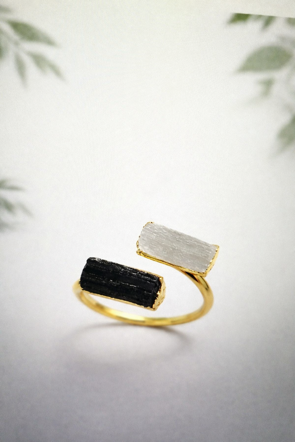 Anel Duas Pedras Turmalina Negra e Selenita – Dourado