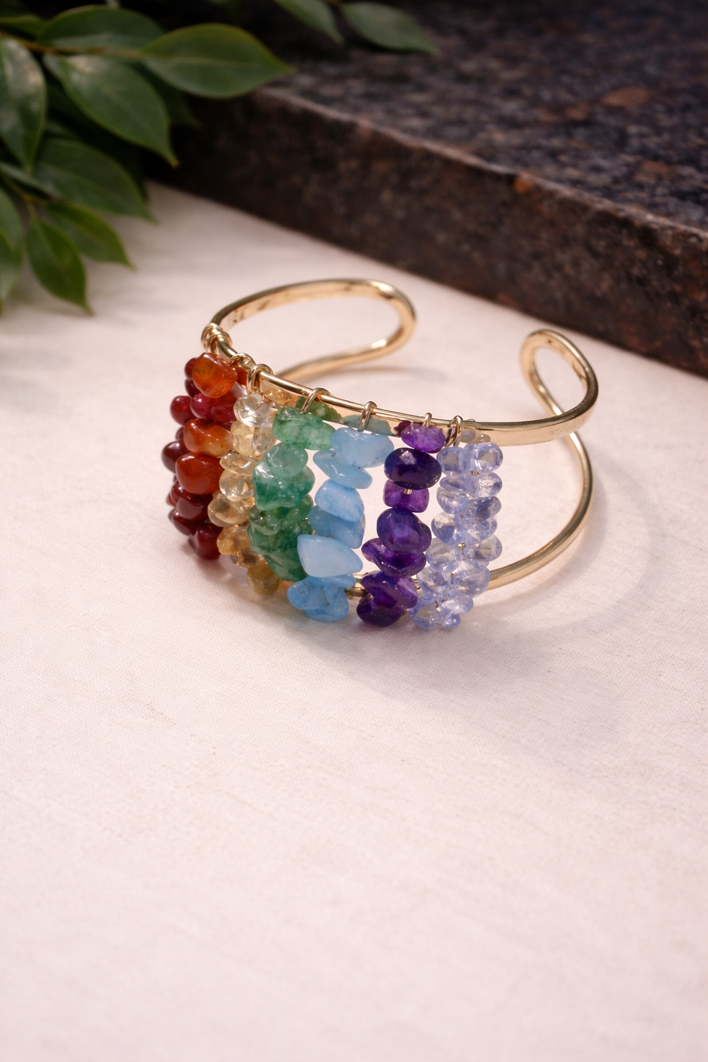 Conectado à energia dos sete chakras, este bracelete reúne cascalhos de pedras naturais que atuam no alinhamento e na harmonização dos centros energéticos do corpo. Cada pedra vibra em uma frequência específica, auxiliando no equilíbrio entre corpo, mente e energia. Uma peça que une cor, energia e movimento, despertando consciência e fortalecendo intenção com leveza e equilíbrio.
