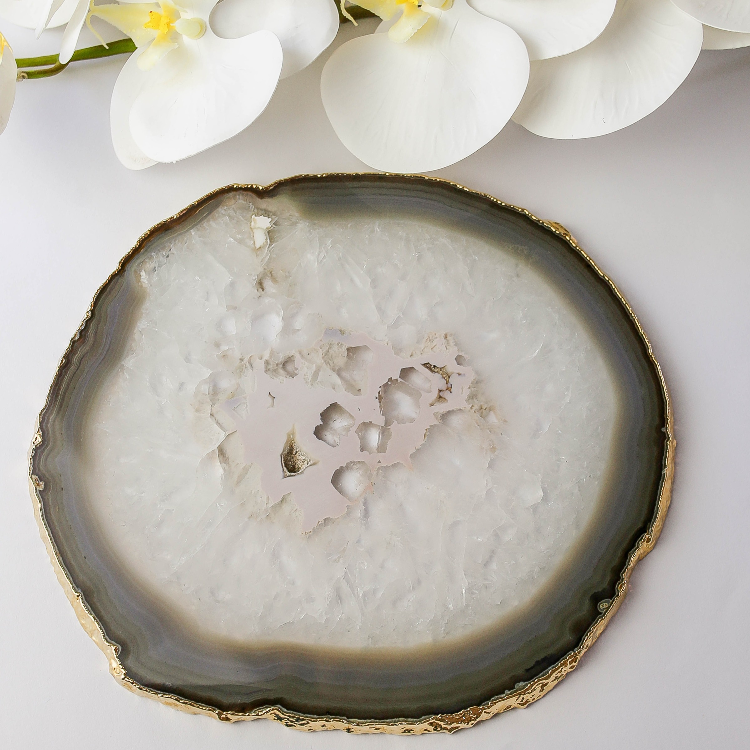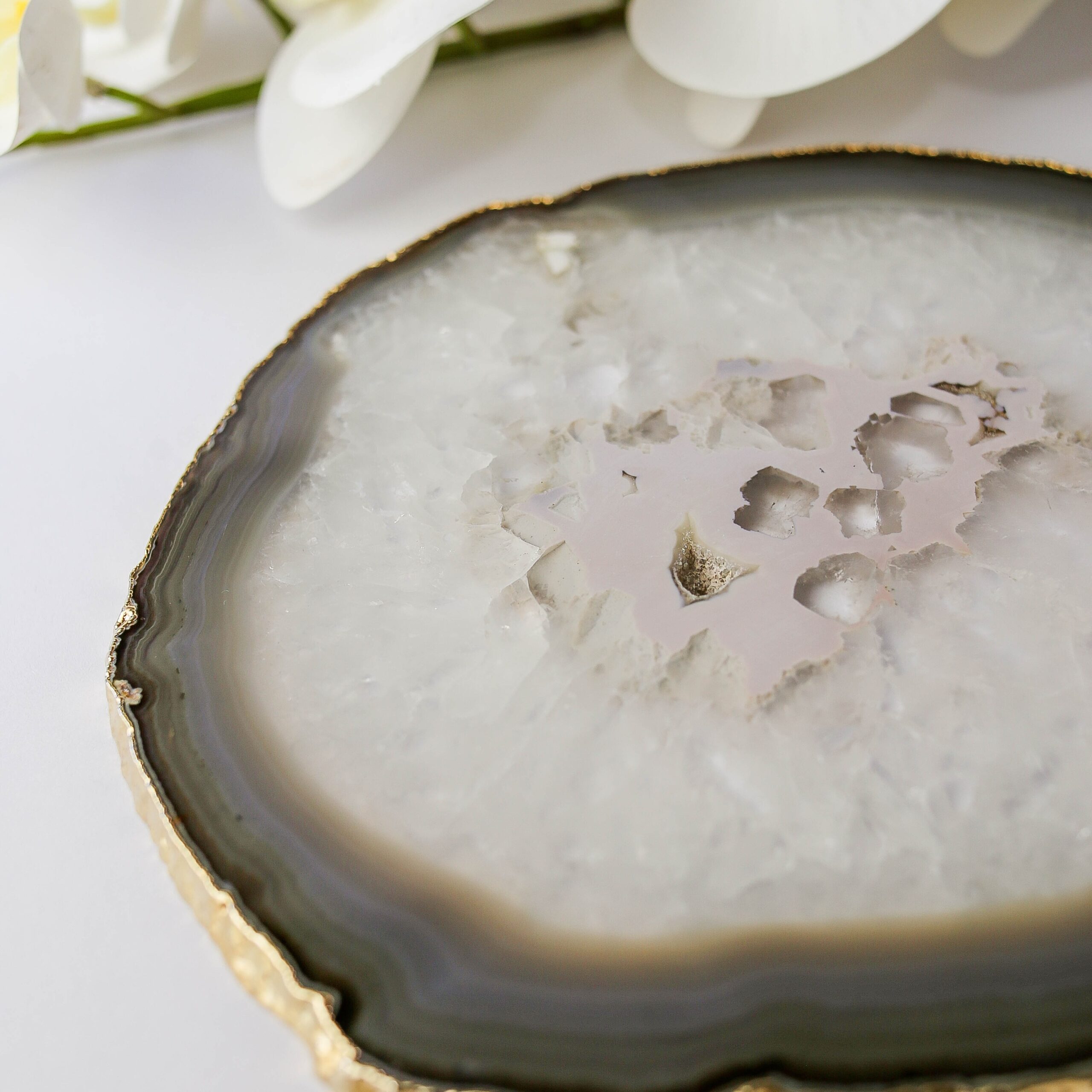 Une a energia estabilizadora da Ágata ao toque sofisticado do dourado. Promove harmonia, proteção e bem-estar, enquanto adiciona brilho e beleza natural à decoração.