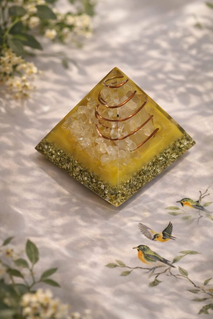 É formada pela combinação de resina, metais e pedras naturais, criando um campo de harmonização energética. É utilizada para auxiliar na transformação de energias densas em vibrações mais equilibradas. Muito usada para proteção energética e limpeza de ambientes, também pode ser colocada em espaços de meditação, trabalho ou descanso, contribuindo para um ambiente mais harmonioso.