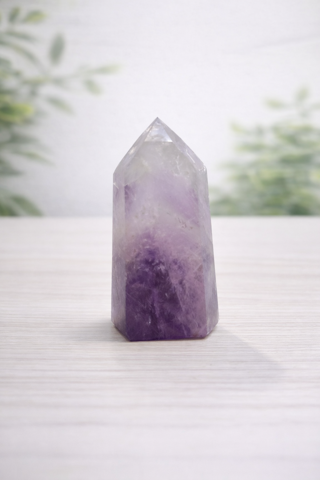 Conhecida por sua energia de transmutação e proteção espiritual. A ponta de ametista auxilia na purificação das energias, promove equilíbrio emocional e favorece estados de calma, intuição e conexão espiritual.